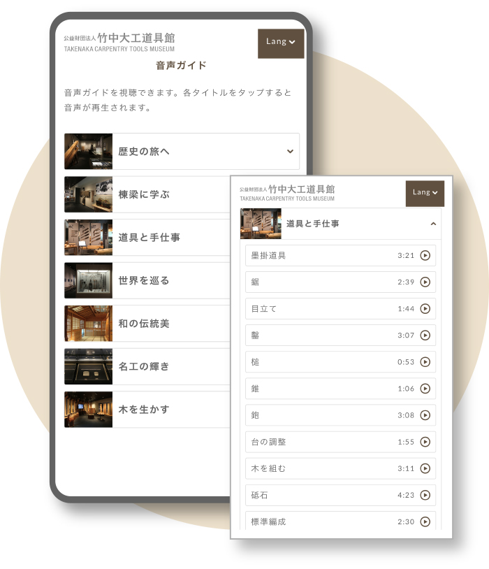 为了让大家更加享受竹中大工道具馆,提供常设展的语音导游。
