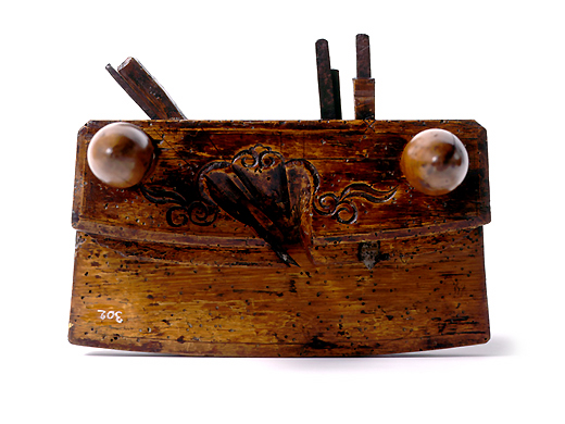 朝鲜传统的墨壶大多是以丝卷部为方形或立方体,墨池部为圆形或球形,以丝头为兽头的3部分构成的。另外,在下部切墨保存用的沟也是其特征之一。照片是以传说中的动物海泰为主题的。