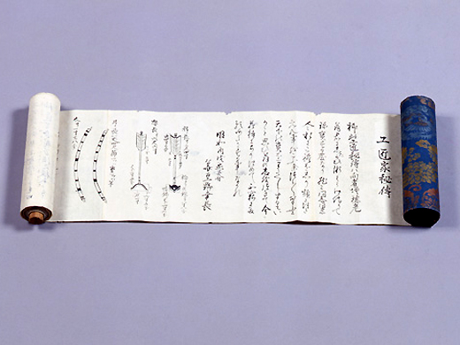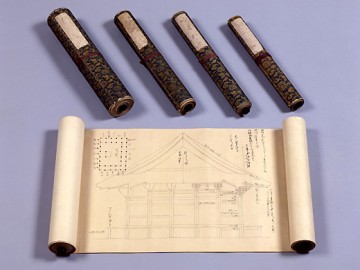 记录了建筑各部分尺寸的方法(木割术)的秘传书形式的卷轴。这是传到江户幕府小建筑方栋梁柏木家的奥书,1689年(1689年)伊兵卫政等向太郎右卫门政虎传授。全五卷由“御所大人”、“神社之部”、“佛殿之部”、“门之部”、“塔之部”构成,是了解江户时代建筑技术和木匠组织的重要资料。