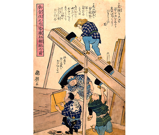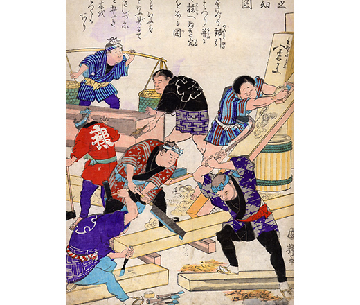 作为面向学童的解说图,明治初年文部省出版的图集。生动地描绘了江户末期到明治初期的工匠们的样子。描绘了木锯使用前锯大锯制作的样子和木匠在角材上涂墨的样子。