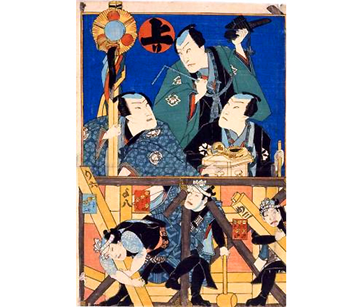 以双六形式描绘了上梁的样子的多色印刷木版画。全部5张中的1张。可以理解江户时代木匠的风俗。下部描绘了建方(组装)的样子,上部描绘了举行仪式的木匠的样子。