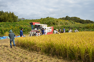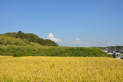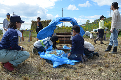 收获是与神户市西区竹之台小学的竹稻草和项目的合作活动。今年春天小学生插秧的稻田里,多亏了以讲师菅野先生为首的照顾者们的管理,结得软软的稻子等待着收获的时候。