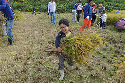 前一天,小学生先收获了。和竹之台地区委员会稻草部的诸位联合割了稻子。大部分人都是第一次体验割稻子,但是在讲师的出色指导下,一转眼就收割了。