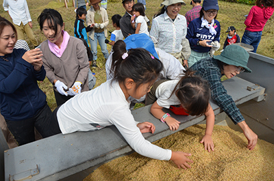 因为也有小孩子参加,所以为了减轻工作,使用了现代的机器,但是一部分以前的脱谷机也可以体验手工作业。