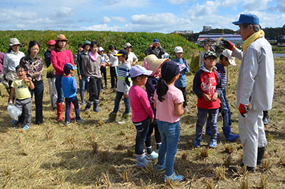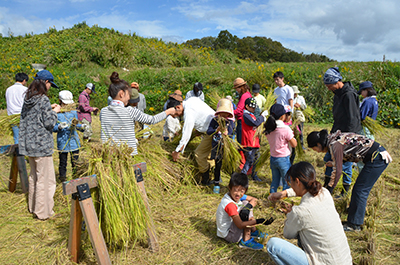 10月20日(星期六)9:30~12:00举办了南之岛的房屋制作展第一次研讨会“用身边的自然建造房子”的割稻子篇。