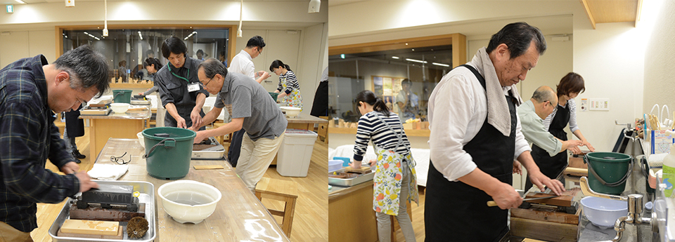 技能人员对家庭用菜刀的研磨方法进行解说和指导。