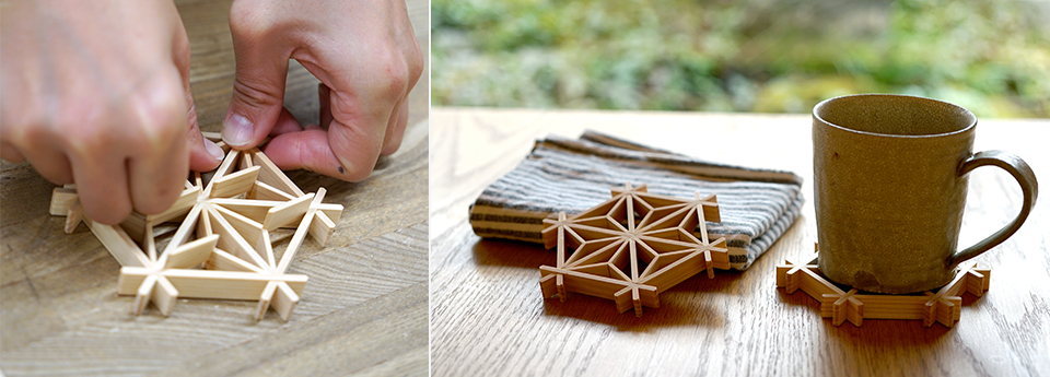 不使用钉子等组装树木,创造美丽花纹的组子技术。看了关于组子的短篇影像后,制作麻叶的过山车。