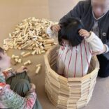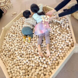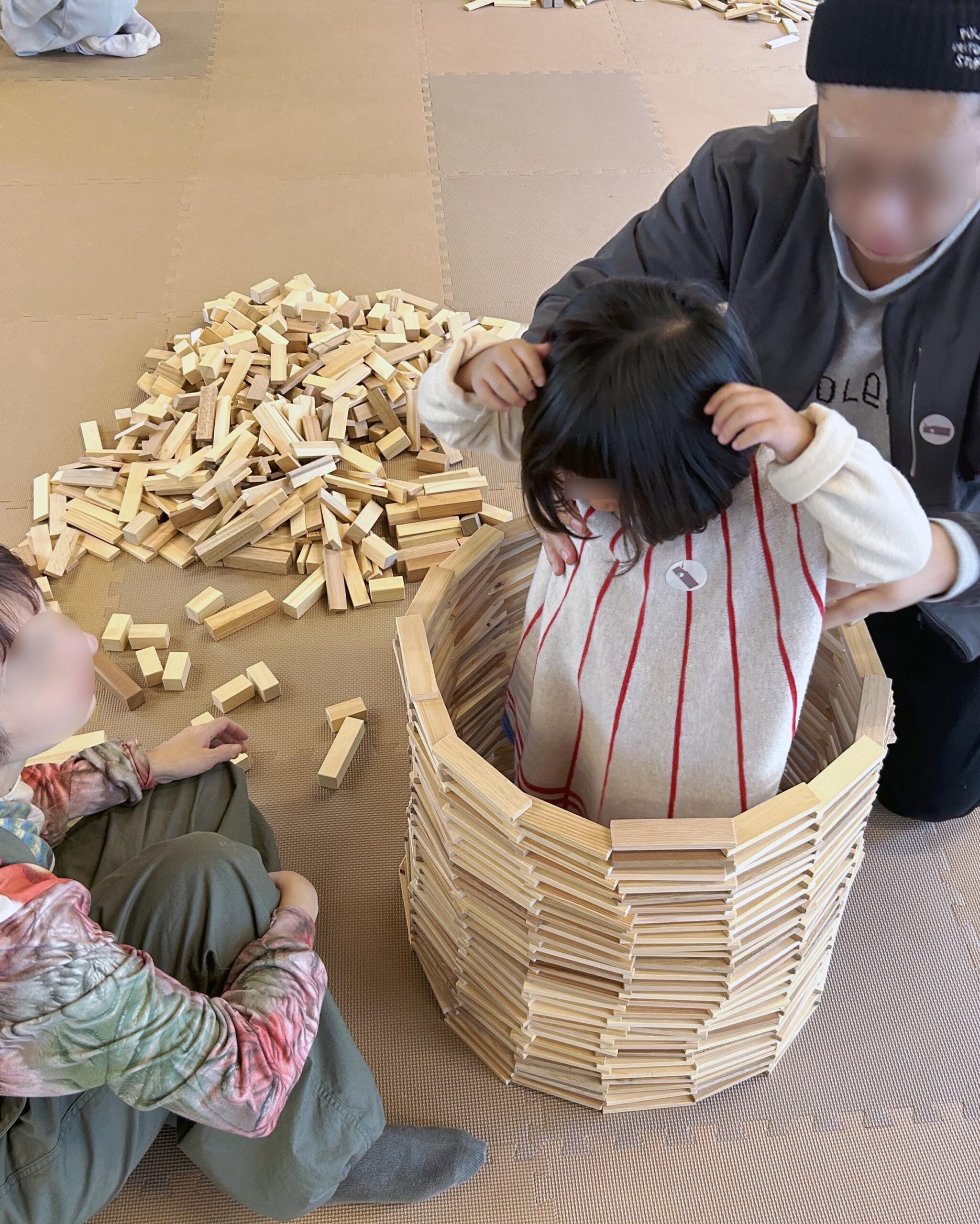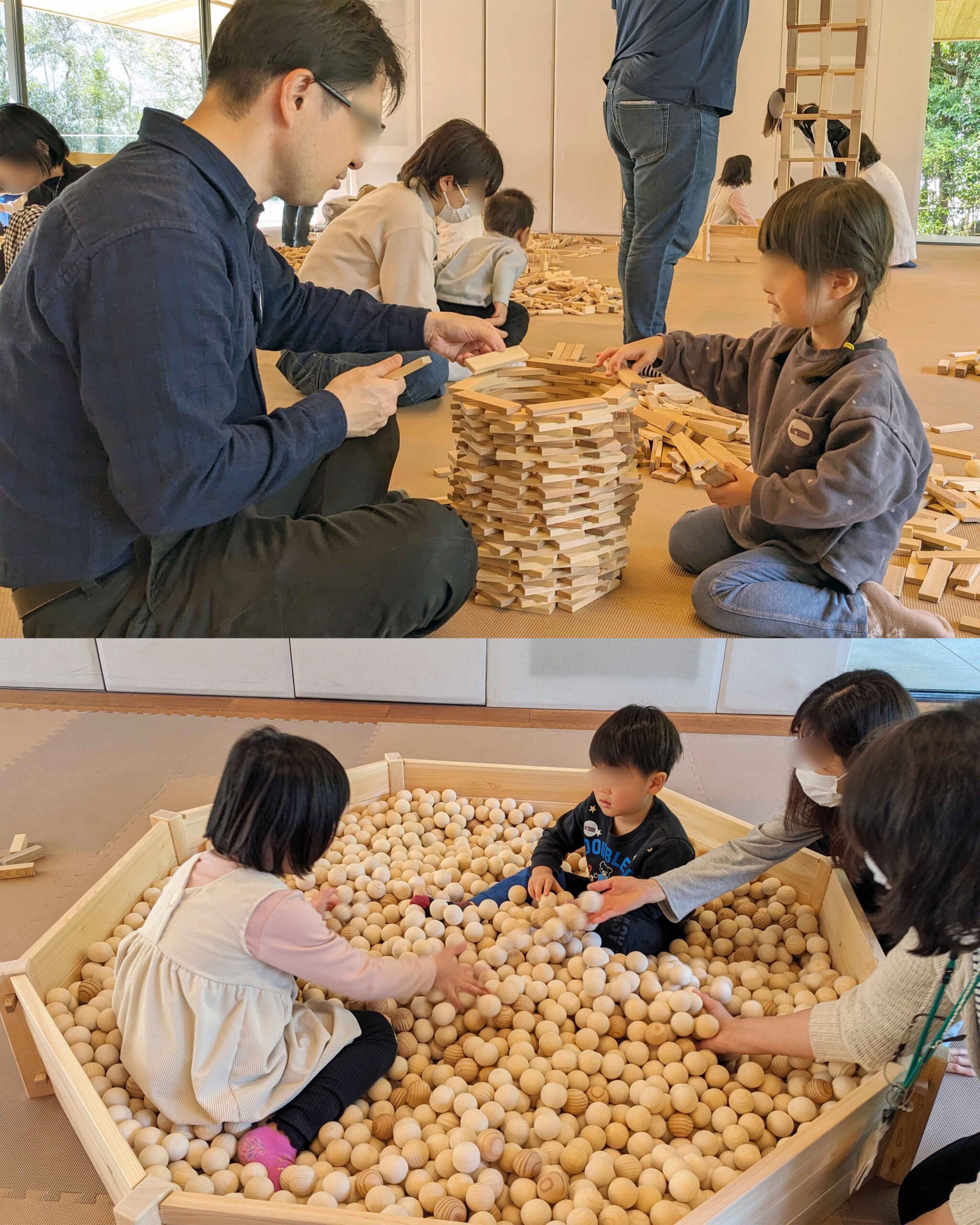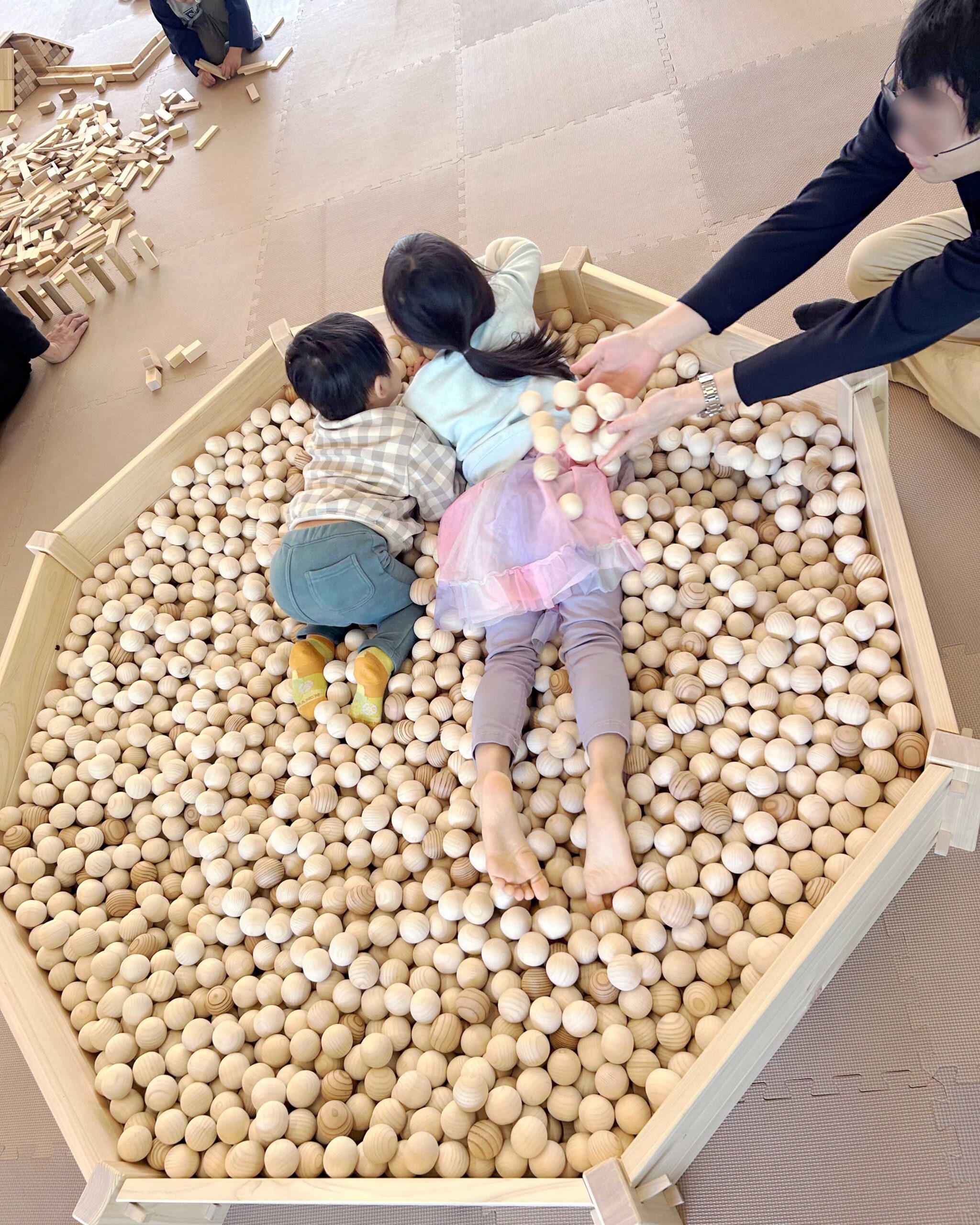不仅准备了积木,还准备了装有很多小树木的游泳池。一边摸着握着享受树木的触感,一边试着埋在树里怎么样?