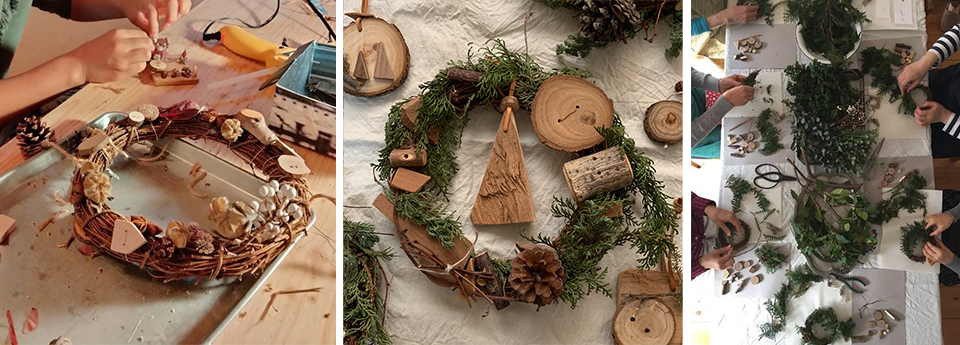 在树枝和碎片上加工,一边享受各种各样的树的表情,一边制作圣诞租赁和装饰品。