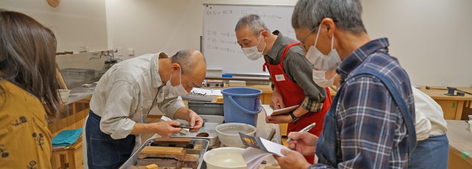 技能员从砂轮的话中解说跳蚤和柑奈的研磨方法,现场表演。