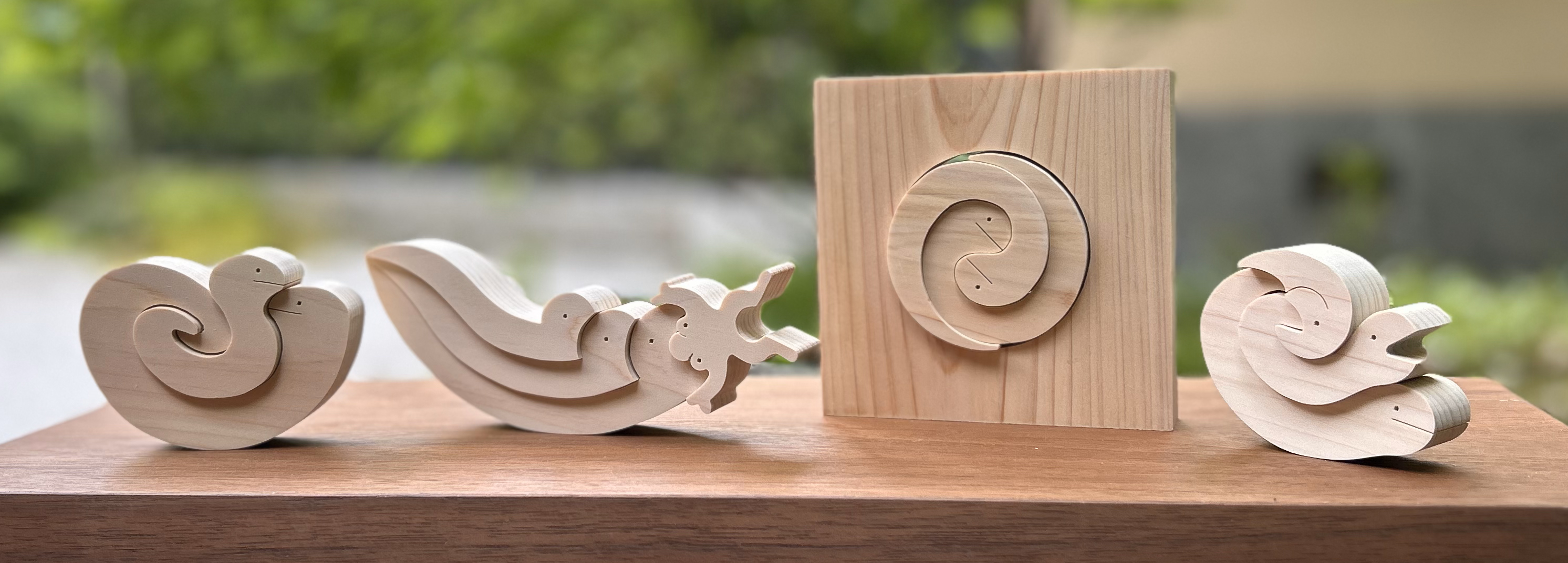 组木作家小黑三郎设计的组木天干地支人偶(巳)用电动线锯制作。