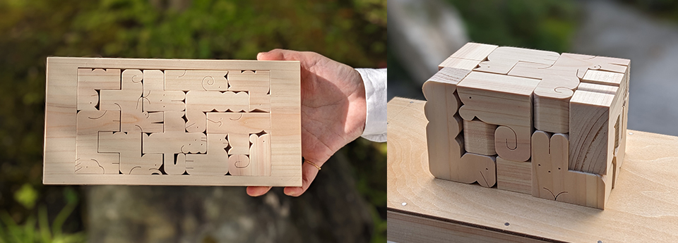 组木作家·小黑三郎设计的组木立体拼图上级篇用电动线的锯制作。