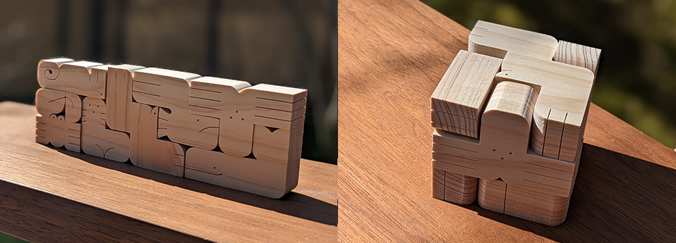 组木作家小黑三郎设计的组木立体拼图用电动线的锯制作。