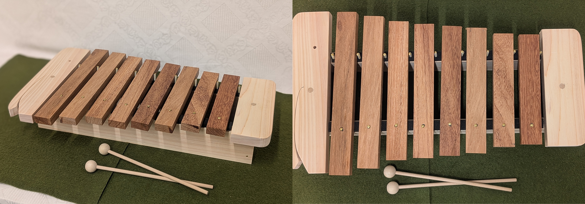 用非洲榉树和丝柏制作木琴。用锯子切下非洲榉树的板做成音阶。完成后大家一起演奏!
