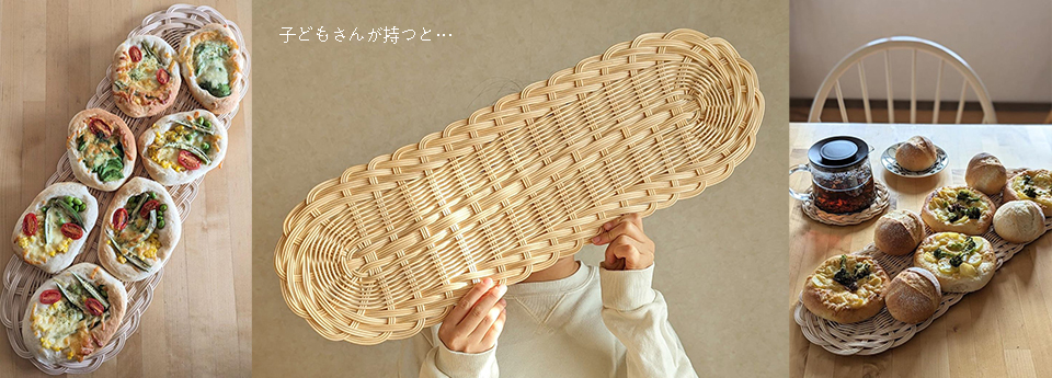 用藤条编织细长的托盘。这是很难在店里卖的尺寸感细长的托盘。