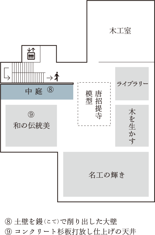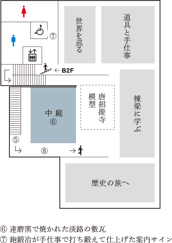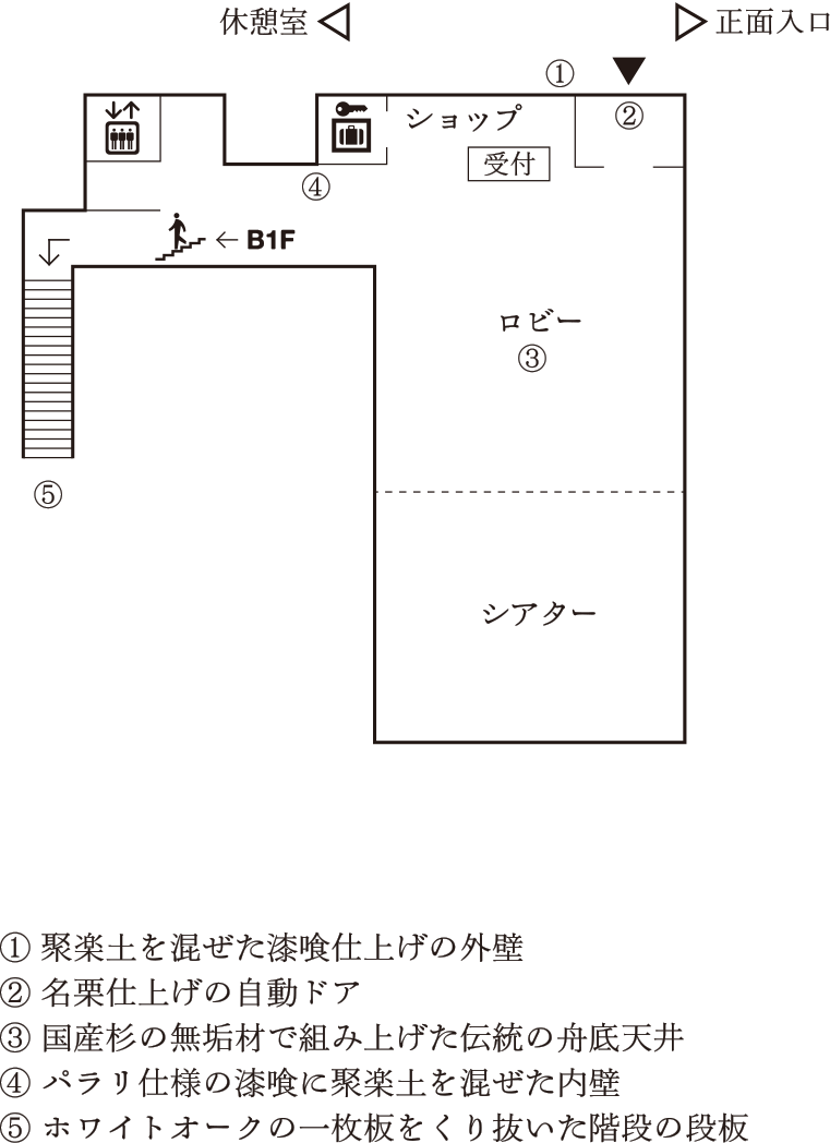 关于坐轮椅、婴儿车入馆,从楼梯附近的斜坡上入馆会很方便。 1楼楼梯东侧有电梯。