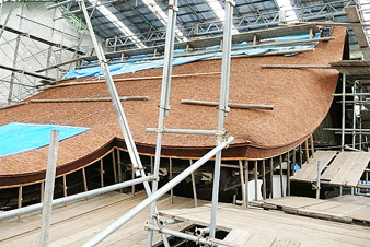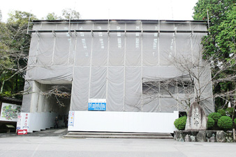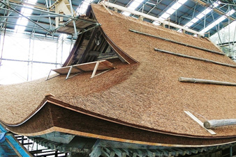 气派的流造向拜是用丝柏皮葺的,重葺基本结束了。能够近距离参观非常美丽的曲线。