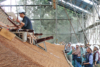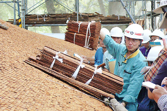 接着,参观了工匠们用丝柏皮葺的样子。大家对有节奏地用竹钉固定蜻蜓和葺材的样子很感兴趣。