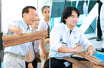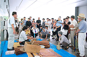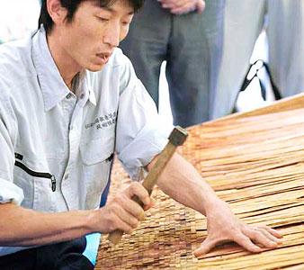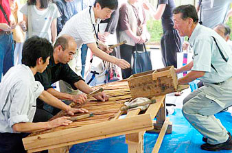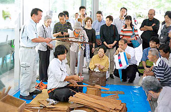 最初从丝柏剥下来的丝柏皮,如何作为葺材一张一张地制作(这个工程称为“造”),请工匠进行了现场表演。