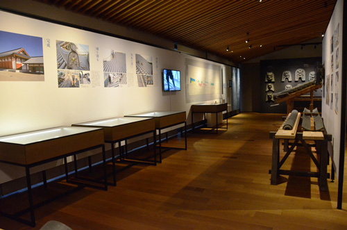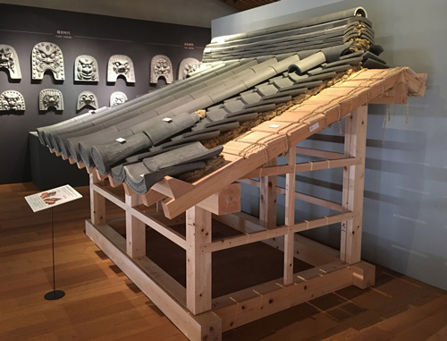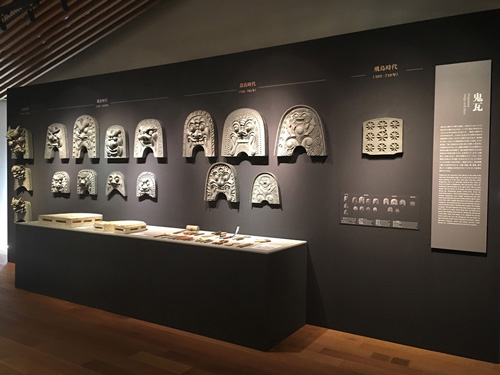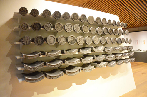 展示场最里面是充满魄力的兽面瓦角。按时代排列兽面瓦,在那之前展示了制作兽面瓦的道具和制作古代兽面瓦的石膏型。