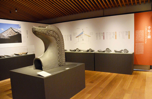 这是千年瓦(瓦的历史)角。中央舞台上展示了兴福寺中正殿的鱼尾形脊瓦(实际尺寸的1/2),左深处展示了屋顶上现役瓦片中最古老的1400年前(飞鸟时代)元兴寺的瓦片。另外,面板上还解说了建筑的变迁和瓦片的关系。