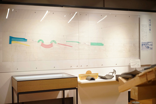 屋顶模型的对面是瓦匠画的原尺寸图。为了讨论屋顶上瓦片是如何收纳的,用实际瓦片的大小来描绘并确认图纸。还展示了用于描绘原尺寸图的模板和用于测量发掘瓦片的道具。