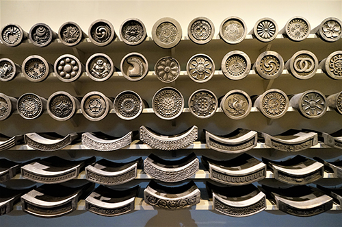 “瓦曼荼罗”在正面入口迎接。请欣赏莲花、文字瓦、卷藤、凤凰、葡萄唐草等装饰屋檐的各种瓦纹。