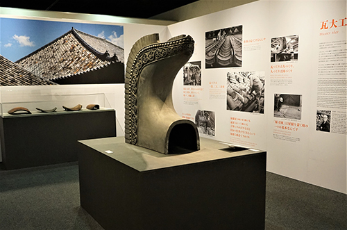 这里是“千年瓦(瓦片历史)”角。从与建筑的关系介绍了飞鸟~江户时代瓦片的变迁。中央舞台上展示了兴福寺中正殿的鱼尾形脊瓦(实际尺寸的1/2),里面展示了直到最近为止乘坐屋顶的1400年前(飞鸟时代)的元兴寺的瓦片。另外,用语言和照片介绍了瓦匠山本清一先生作为瓦匠的气魄。