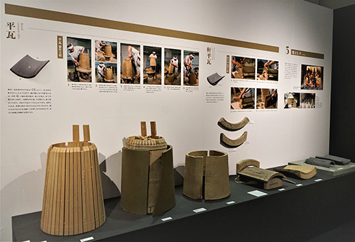接下来是“制作古代瓦片”的环节。从原料的土到丸瓦、平瓦、屋檐丸瓦、屋檐平瓦的成型工序用道具和影像进行解说。