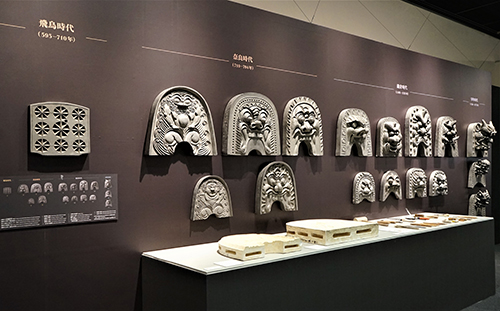 “兽面瓦”环节。为了一眼就能看出兽面瓦的变迁,飞鸟~室町时代分别展示了兽面瓦。展示台上放置着制作古代兽面瓦的石膏型和现代鬼师使用的道具。