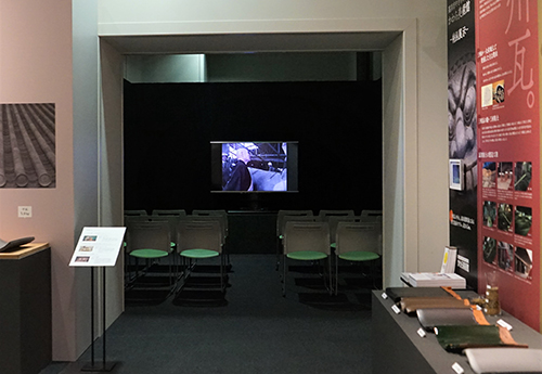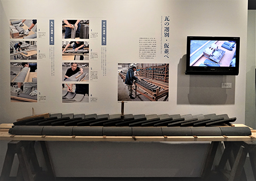 瓦片的选定、临时排列的展示。瓦片是陶瓷,旧瓦片和新瓦片的曲率不同。因此,在瓦葺之前,要事先试着葺一下。这个环节的对面用道具、面板、影像介绍了在屋顶上葺瓦片的工序。