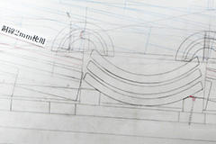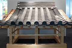 设置了实物大小的屋顶模型、瓦匠用手描绘的瓦屋顶的原尺寸图、葺时使用的型板和手具、实际试着葺的手把手角等,介绍瓦是如何葺的。