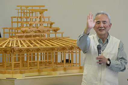 首先,以现在正在进行的正殿新建工程为例,使用1/20结构模型解说了支撑日本建筑大屋顶的构造和美丽的特色。为了建造寺院的正殿,需要庞大的木材和工匠的工作,搬运大的部件,组装的工夫也被说了。