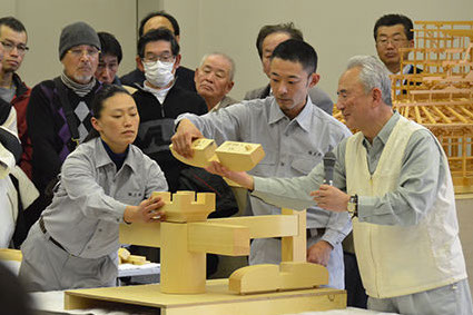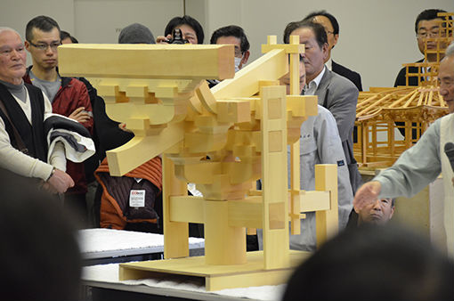 接下来,使用1/2的部件模型,组装支撑深屋檐的“组装物”的现场表演。解说了使用达沃这个接合部件,柔软地装载的组装物,在地震的摇晃中也能灵活地移动,形成了强的构造。