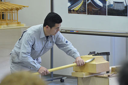接下来是使用丸刨、蝴蝶、锉刀等道具,圆柱、肘木、斗等堂木匠特有的雕刻、完成的表演。对于平时很少看到的堂木匠道具、创造独特曲线的技能,到场的各位都感叹不已。
