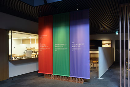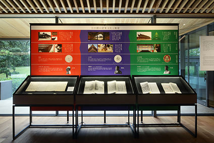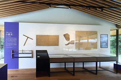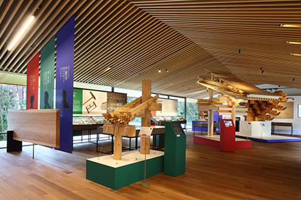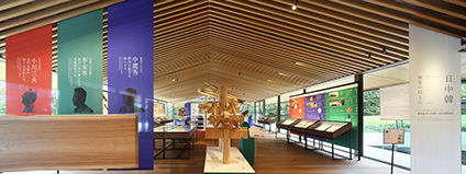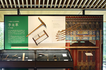 是前奏。面板紧凑地解说了中日韩的建筑文化和栋梁的特征。箱子内是与中国、韩国的宫殿技术相关的书籍和日本的木匠技术书等文献展示。