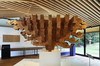 由韩国申鹰秀栋梁制作的实际尺寸大小的组合模型。由树龄200年以上的优质赤松制成,可以欣赏到作为韩国建筑特征的华丽的组装物雕刻。