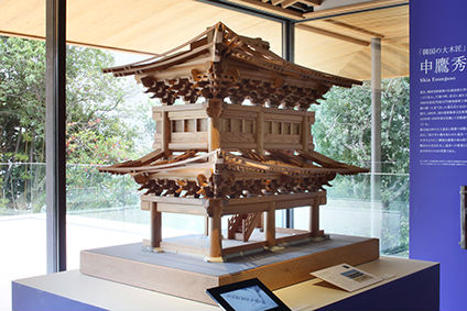 是日本专柜。中央是药师寺东院堂的二分之一缩尺模型。可以看出丝柏的质感和精致的完成技术,以及支撑着深屋檐的小屋后面的工夫。