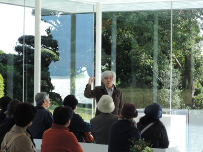 向导由竹中工务店的松隈章先生担任。从1990年开始是盐屋的居民,与这次参观的詹姆斯宅邸的保存活用也有关的人(照片是在詹姆斯宅邸庭园角落建造的玻璃教堂)。