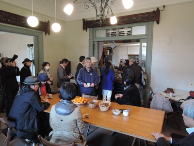 在外面说明后,一边喝咖啡、红茶一边休息后参观了建筑物,在1楼的大厅里进行了松隈先生和森本先生的迷你演讲。作为音乐活动和派对等会场,旧古根海姆邸毫不费力地自然地被活用,与所谓的“文化财产”的修理和活用的范本一样的詹姆斯邸形成了鲜明对比。