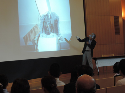 首先是藤森先生的演讲。采用钢筋造和钢筋混凝土造,先驱者技术的萌芽是在外行乱七八糟的地方产生的,以此为宗旨,介绍了钢筋混凝土的发明者莫尼耶制作的供水塔、连窗边的栈房都用混凝土浇筑而成的建筑物等有趣的事例做了。