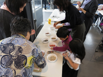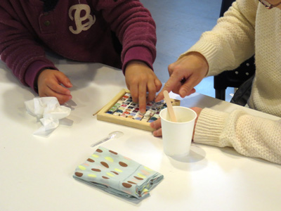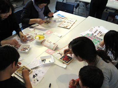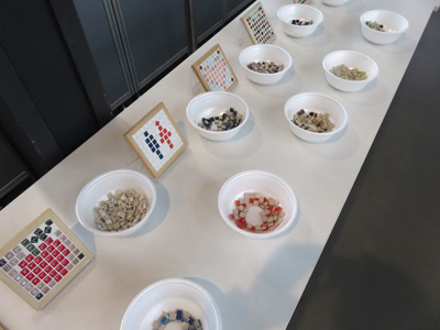 然后考虑到做好的设计,摆出瓷砖。是具象性的设计,还是几何形状,颜色统一还是变化等,各自考虑后决定瓷砖的配置。这项工作,成年人似乎需要一些时间。