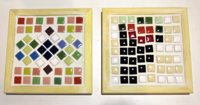 这次是将1cm角的瓷砖排列,制作10cm角的马赛克艺术的约2小时的项目。这是这次使用的瓷砖和完成的样品。