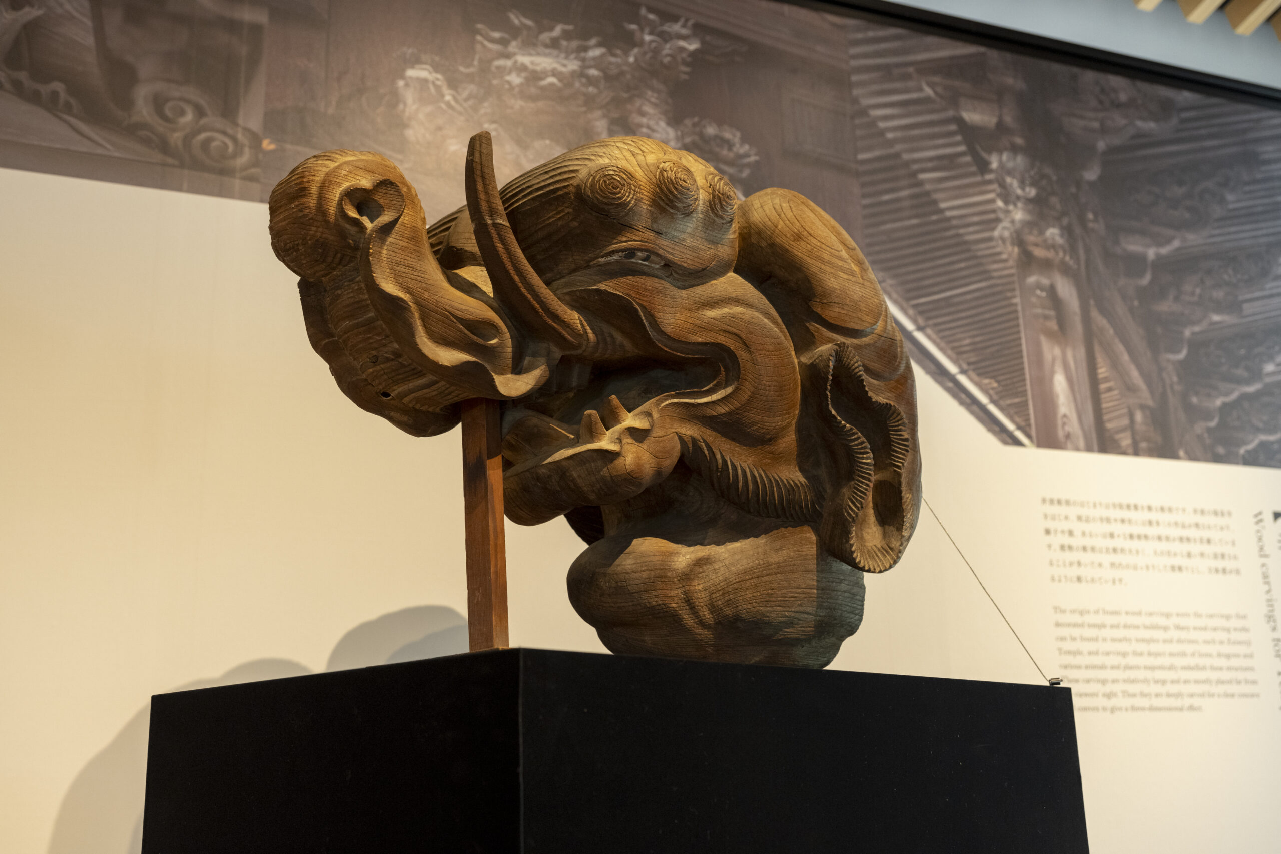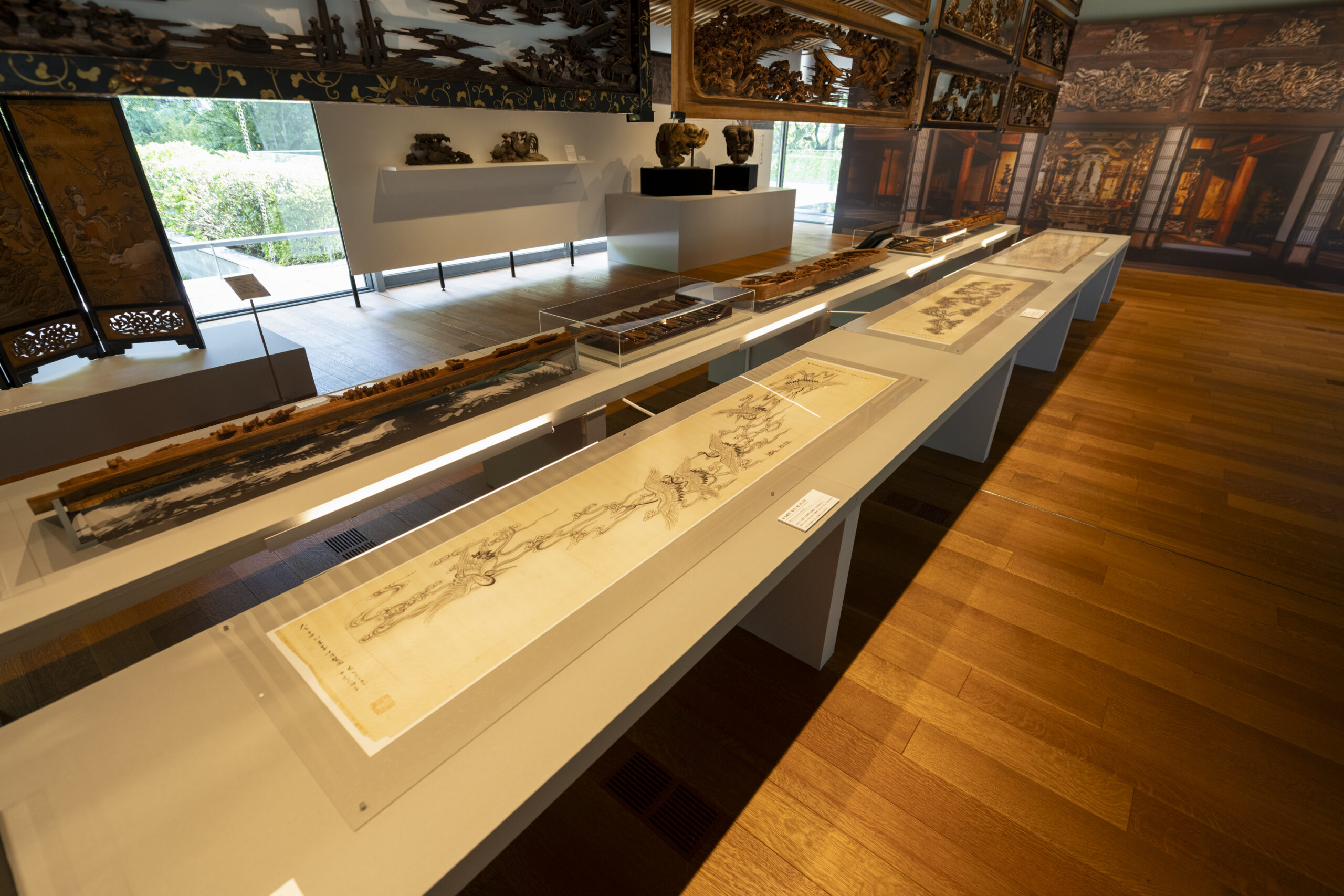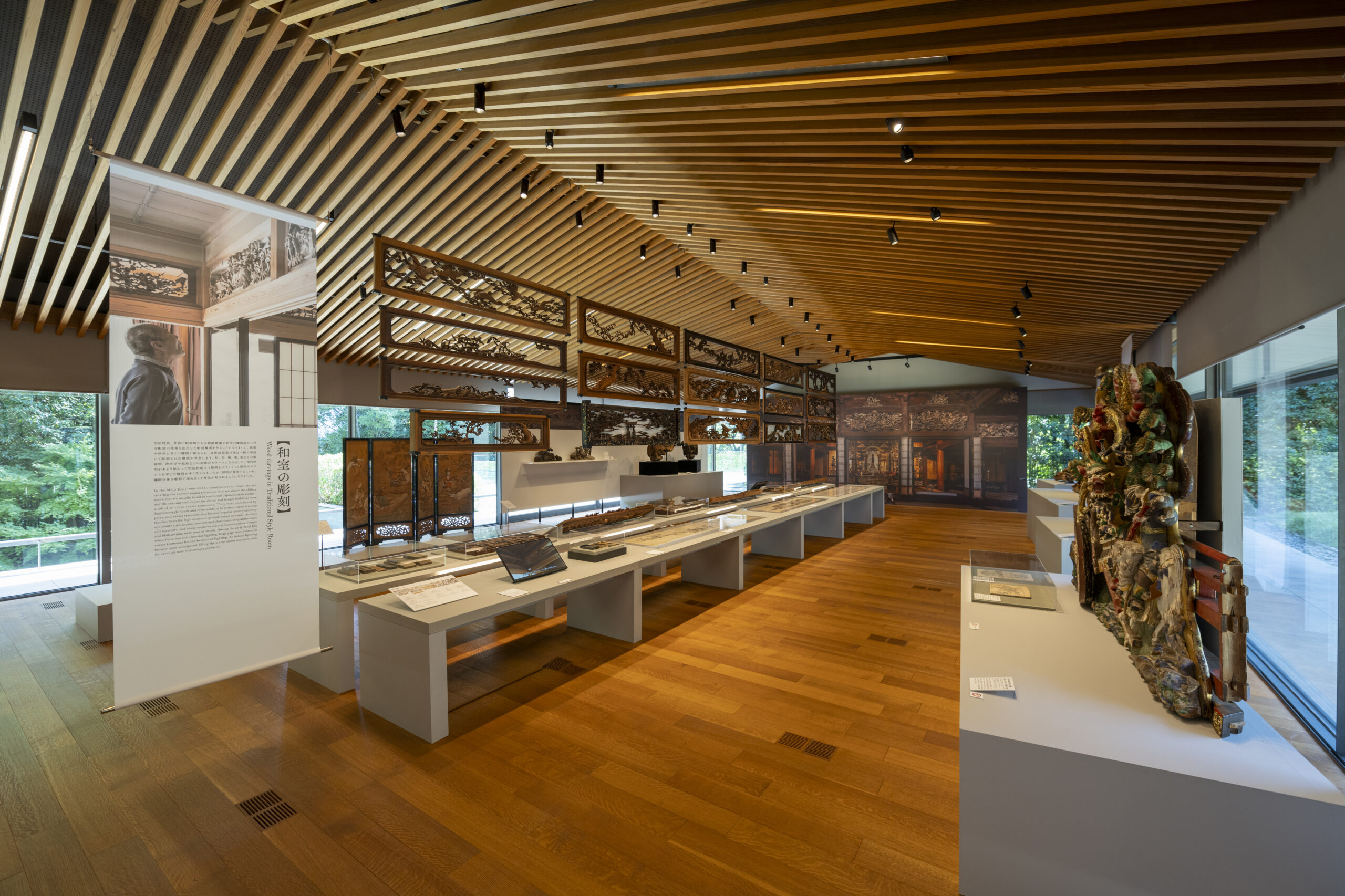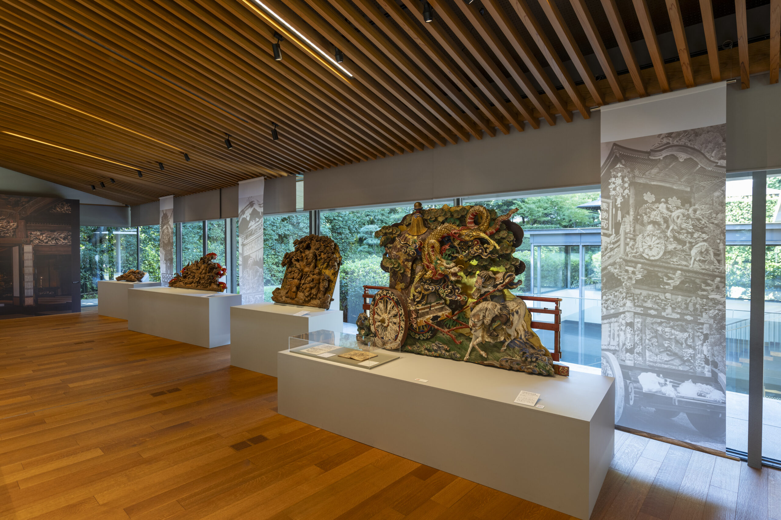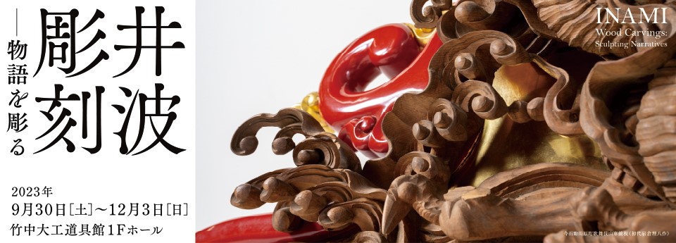 展览会上,展示了大胆的深雕刻、浓缩了高度的木雕技术的寺院雕刻、装饰豪华绚烂的祭祀摊子的精致的彩车雕刻,以及明治时期以后作为住宅栏杆发展了巨大的纤细优美的雕刻栏杆等。另外,使用200支以上的凿子和雕刻刀的制作工序将通过实际使用的道具和底图、影像等进行介绍。