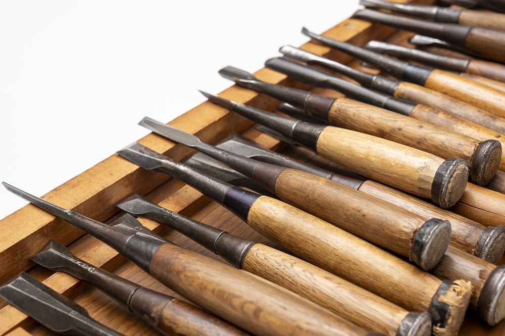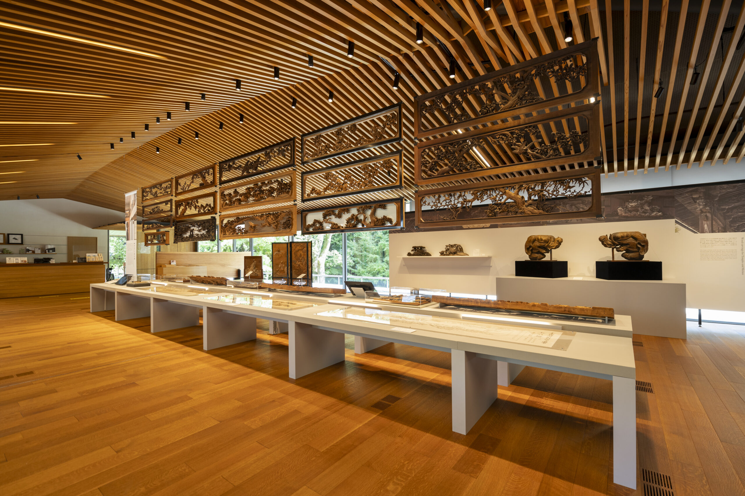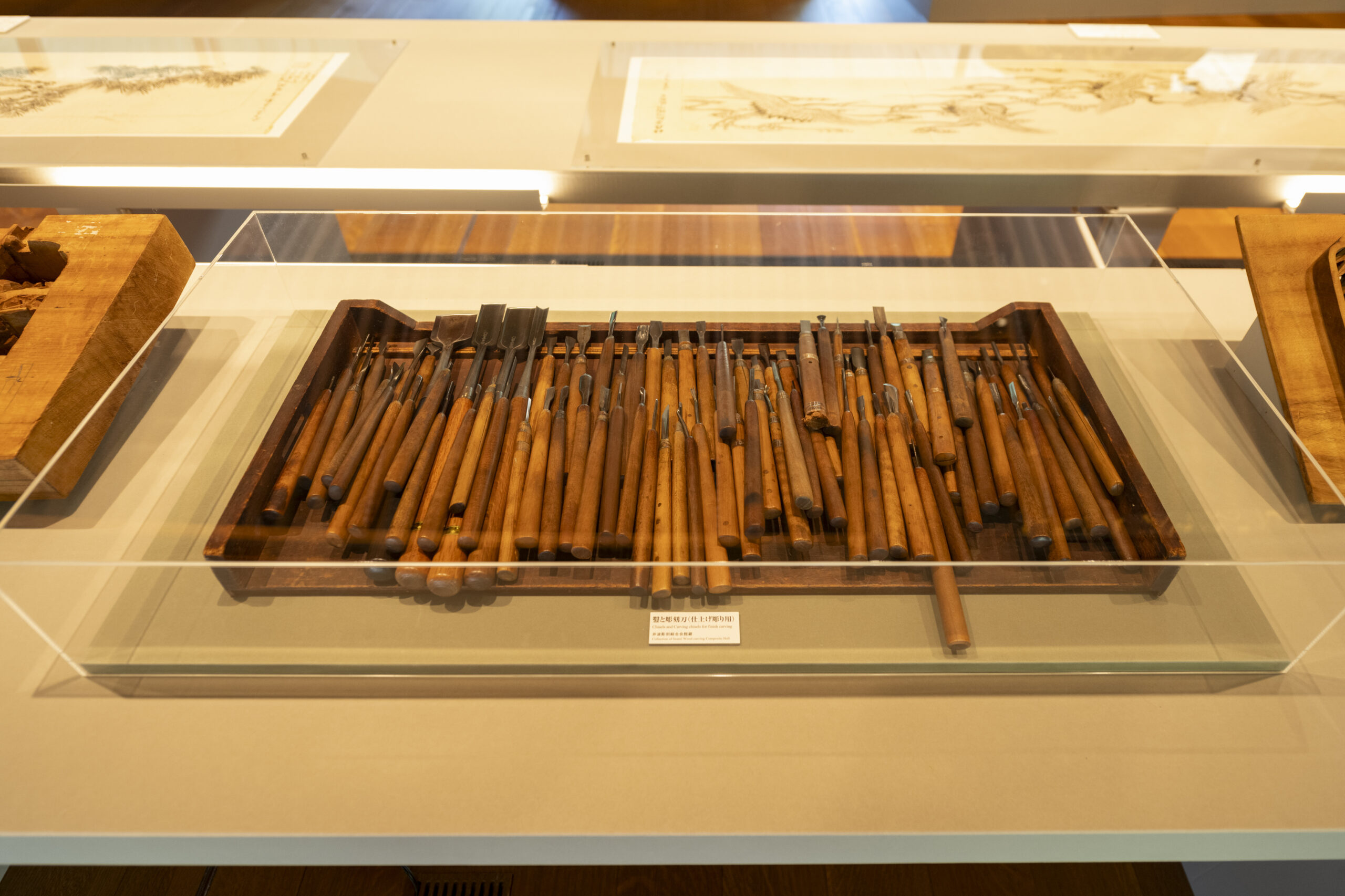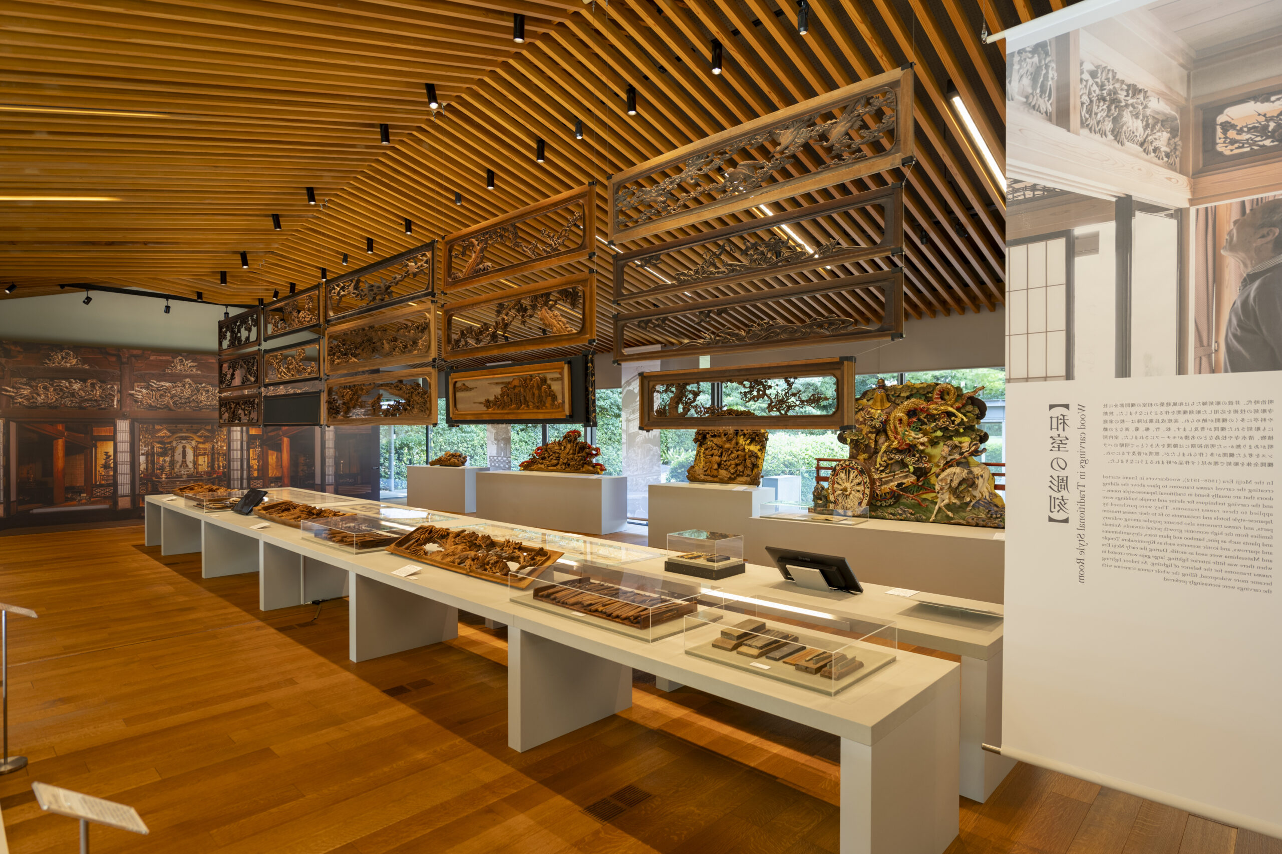展览会上,展示了大胆的深雕刻、浓缩了高度的木雕技术的寺院雕刻、装饰豪华绚烂的祭祀摊子的精致的彩车雕刻,以及明治时期以后作为住宅栏杆发展了巨大的纤细优美的雕刻栏杆等。另外,使用200支以上的凿子和雕刻刀的制作工序将通过实际使用的道具和底图、影像等进行介绍。