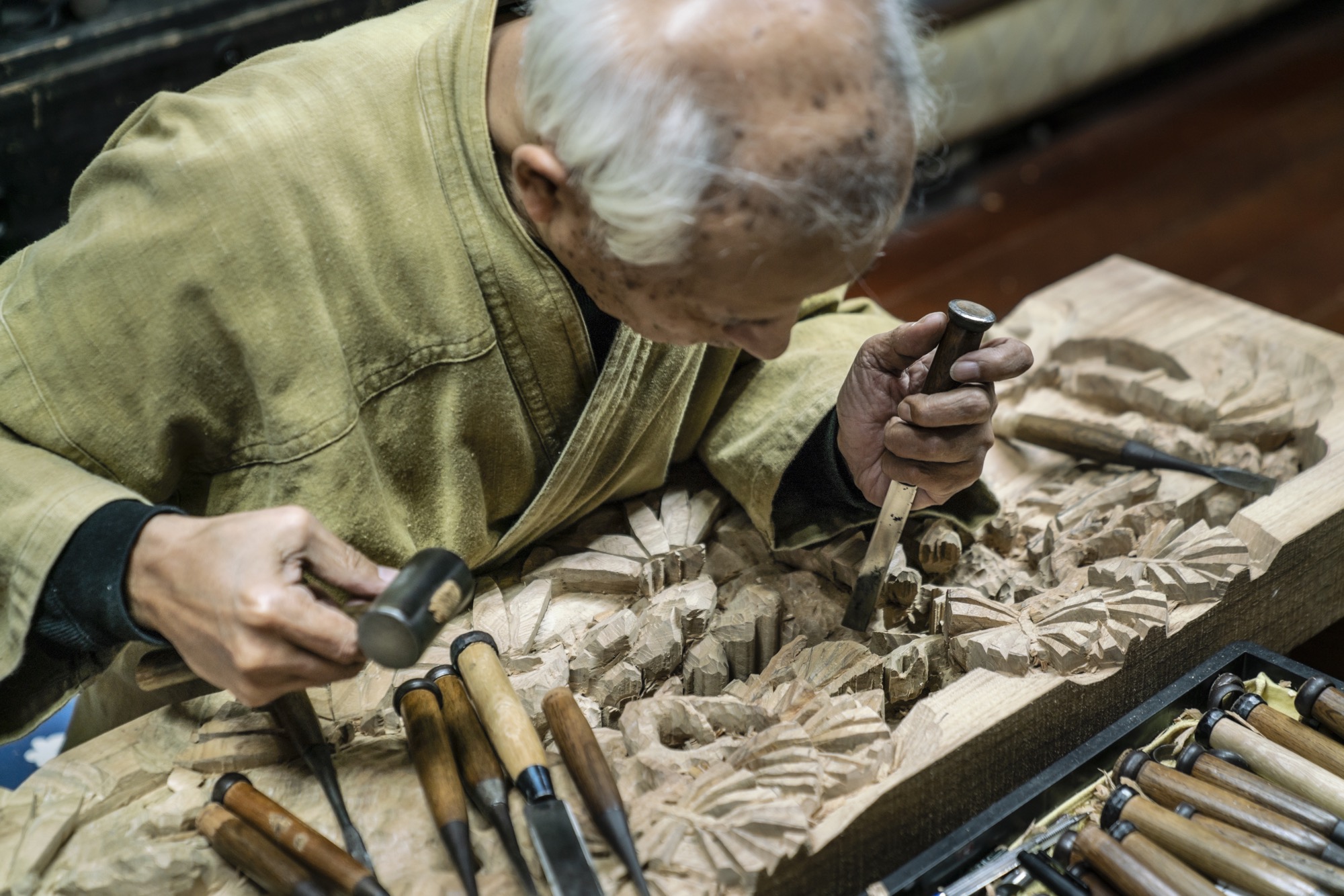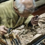 富山县南砺市井波是日本代表性的木雕城市。在贯穿市中心的八日町街上,很多木雕师们连成工房,在有石板风情的街道上回响着打凿子的锤音。