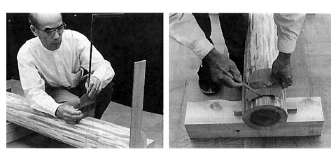 把竹签从两侧推着停着。竹签的部分是可移动式的,将其按照圆木的断面等曲线拍摄其形状,然后再转移到其他方面(参照照片)。