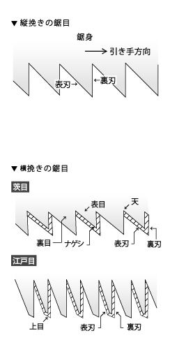 横锯的锯齿如左图所示,上刃、里刃的正面被锐利削掉(ナゲシ),像小刀一样切断树木的纤维。每颗牙齿交替向左右排列。再和竖锯一样蘸蛤蜊。 锯齿有几种类型。与简单制作的荆棘相比,江户目如图所示,用锉刀将前端磨碎,并获得了上眼。