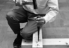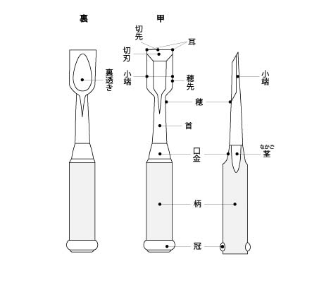 凿子是在材料上打洞、削下细小部分时使用的,在我国是和锯子、刨子并列加工不可或缺的工具。由铁制的刀具部分和用于抓住手的木材花纹部分构成,刀具部分为了容易开孔而缩小形状,制作细长的脖子。刀尖和刨子一样,是在削木用的钢上锻接地金的构造,用柔软的地金插入甲表、脖子、柄的库密共和国部分。