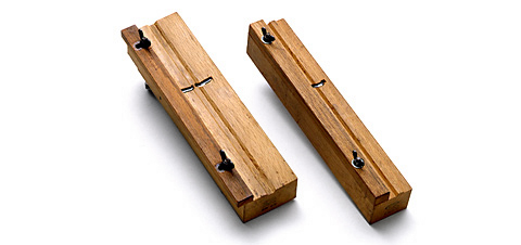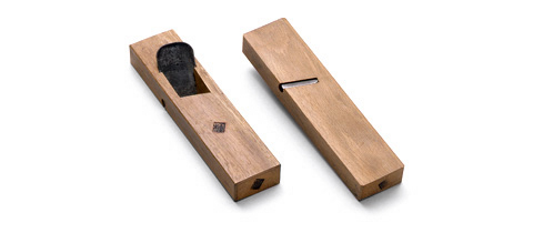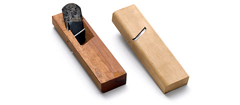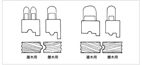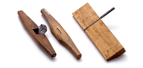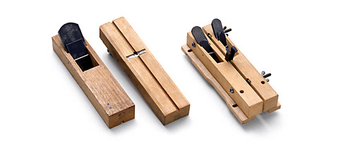 把台子缺一段作为尺子,削凹面的刨子(雌木用)和同样削凸面的刨子(雄木用),两个是一组(图10)。为了防止从防雨窗和玻璃窗等处渗入风雨,在建筑材料类相邻的框框的一方制作凹面,另一方制作凸面,使其无缝地关闭。也有尺子可以用螺丝调节的。在雄木用的刀刃上,也有将两枚刀刃并列制作而成的。凹凸的面除了角型以外还有圆形,圆形多用于西式建筑。